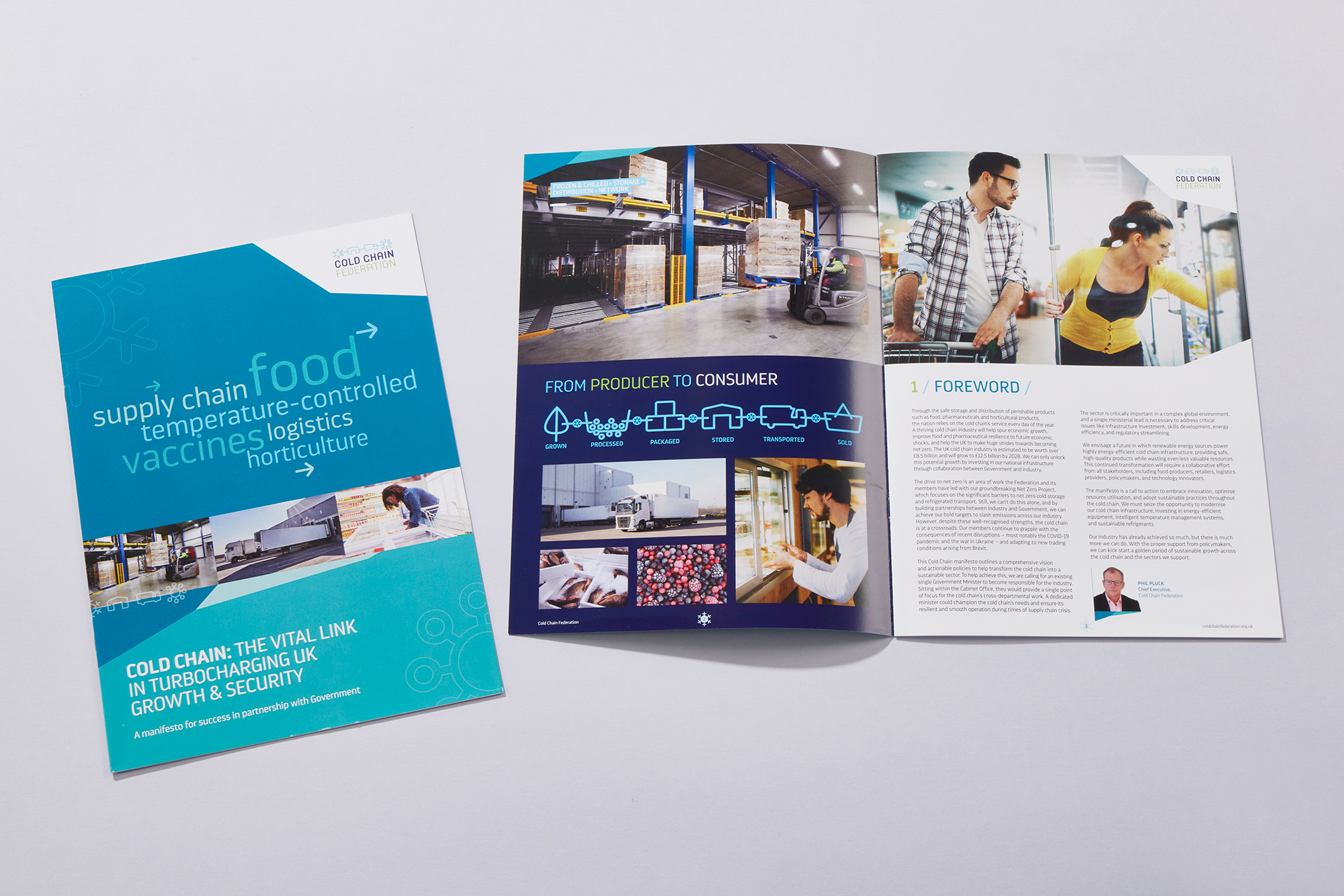 We wanted to retain the Federation’s positive, existing attributes, while adding new, progressive brand traits: dynamic, innovative and energetic. The primary logo for the Cold Chain Federation was designed to act as a visual explainer of the industry to those outside; a chain of four linking symbols each representing: frozen and chilled – storage – distribution – onward network.